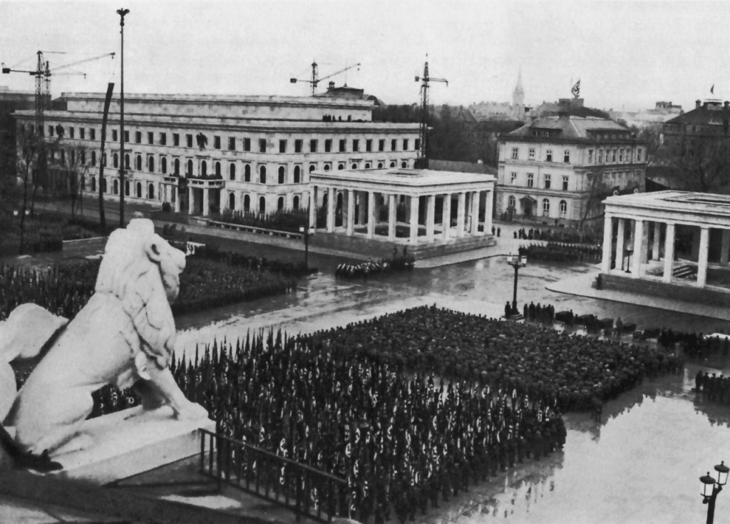 Aufstellung der Formationen am 9. November 1935 zur Überführung der »Blutzeugen« auf dem Münchner Königsplatz in die »Ehrentempel«, im Hintergrund links der »Führerbau« kurz vor der Fertigstellung, Architekt: Paul Ludwig Troost