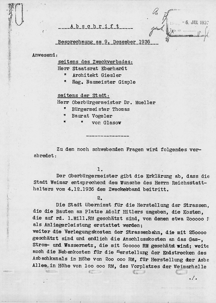 Beitritt der Stadt Weimar zum Zweckverband »Bauten am Platz Adolf Hitlers«, Protokoll (Abschrift) der Beratung am 9. Dezember 1936, 1/2
