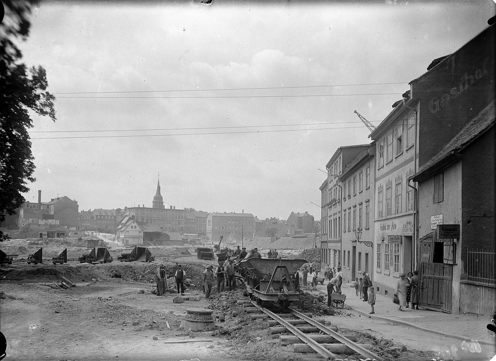 Blick auf den Bauplatz des Gebäudes der Deutschen Arbeitsfront. Im Hintergrund die Ludendorff-Straße (heute: Ernst-Thälmann-Straße), 1937